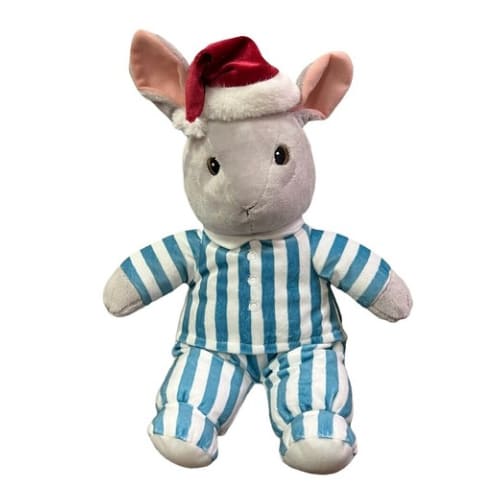 This seasonal plush features a blue/white rabbit with a pink bow and embroidered eyes, making it an easy gift choice for spring and holiday occasions.